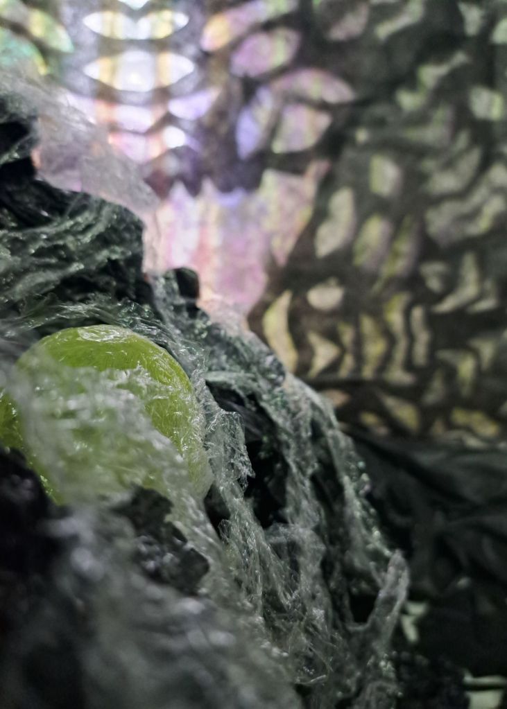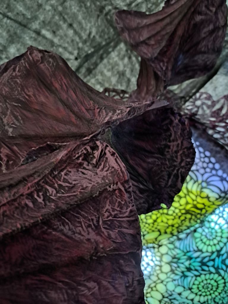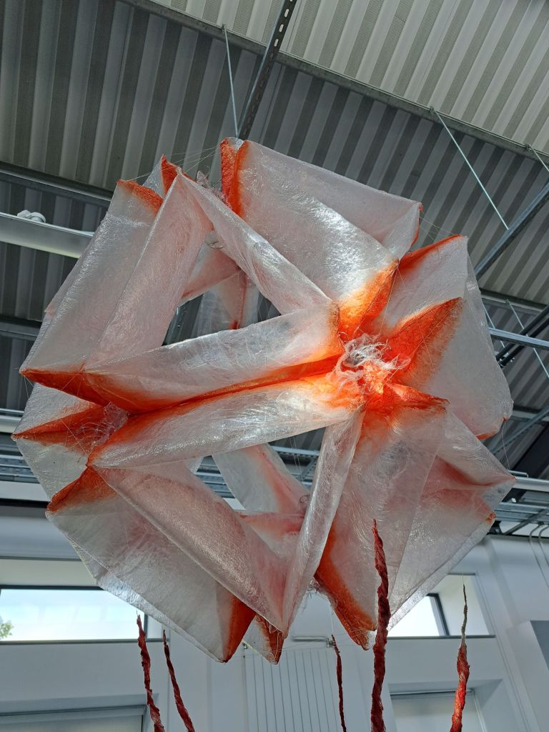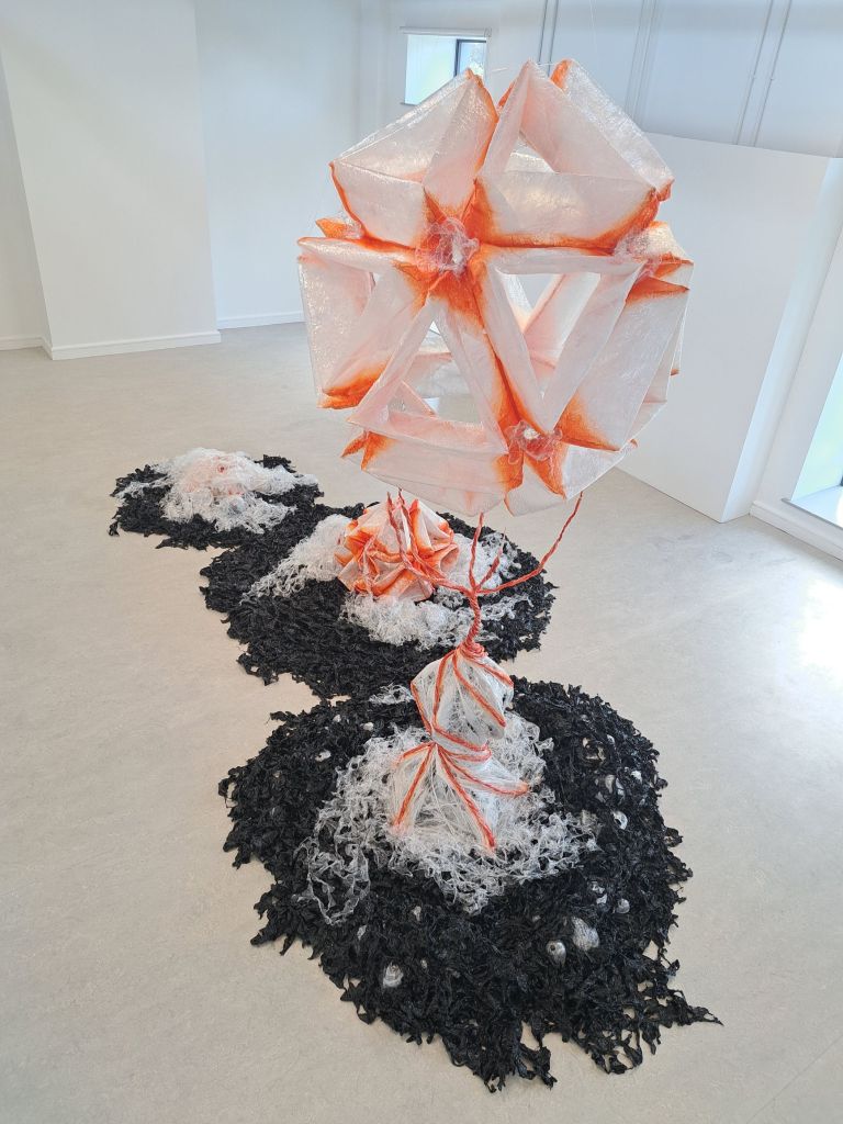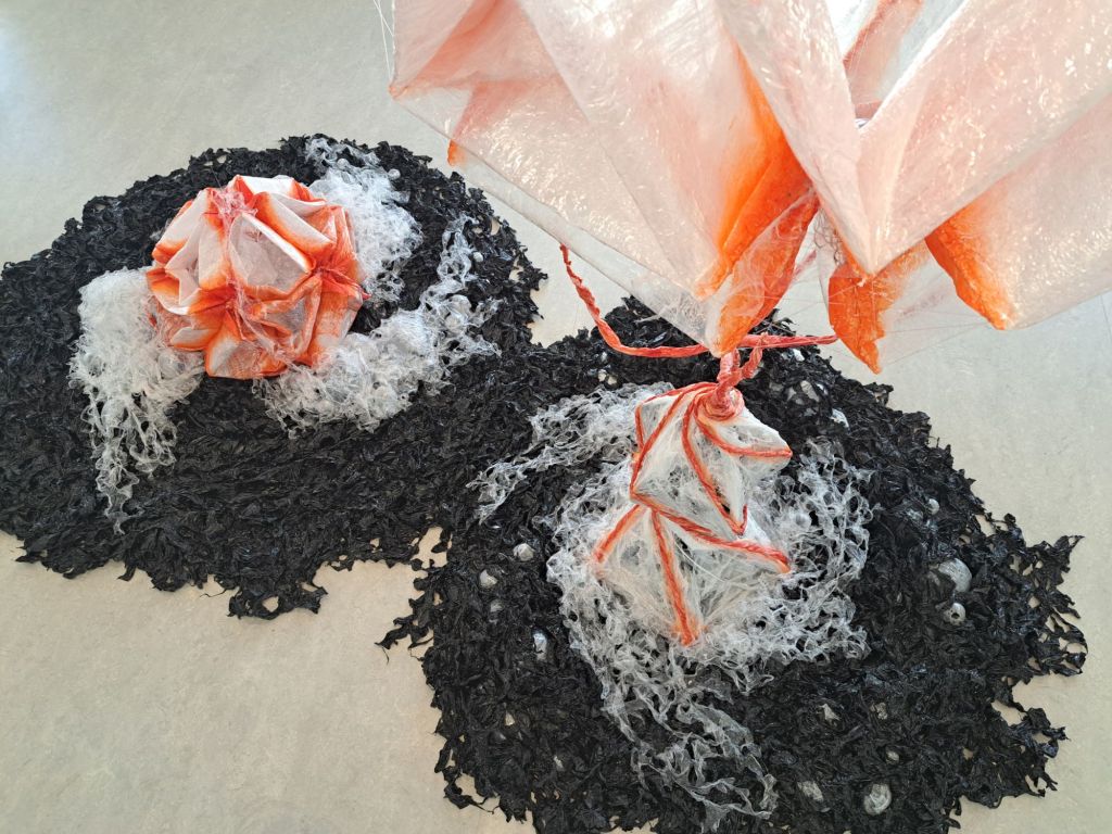 May’s practice investigates the interdependence existing between humans, the natural world and all the myriad of lifeforms within it. In our troubled times her artworks aim to be a counterbalance, a refuge, and a sanctuary, where hopes and wishes can form and eventually help transform our reality. Recycled plastic is manipulated by heating, folding, cutting, and stitching into organic forms. This process highlights the beauty, which can be found unexpectedly, in the mundane and discarded. Natural light is celebrated, and technological aspects are deliberately kept to a minimum. Contemporary artworks by artists Emma Talbot and Celina Muldoon, who in their practices make similar enquires, functions as important catalysts for the creative process. Collective and personal grief, and how to mend our shared broken history, are recurring themes in May’s practice.
