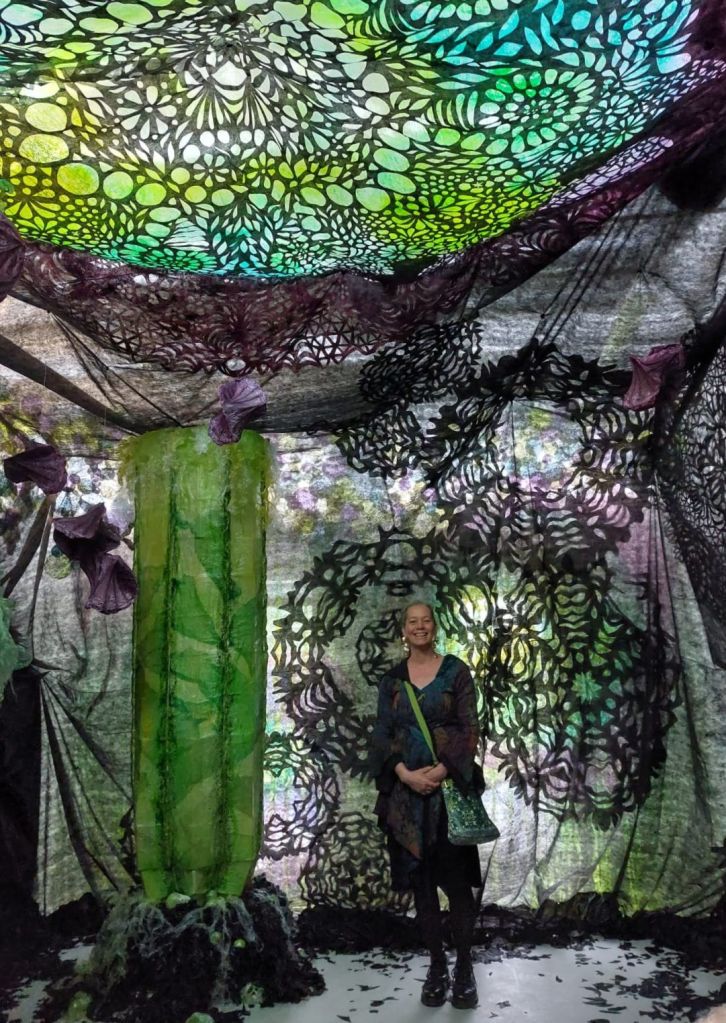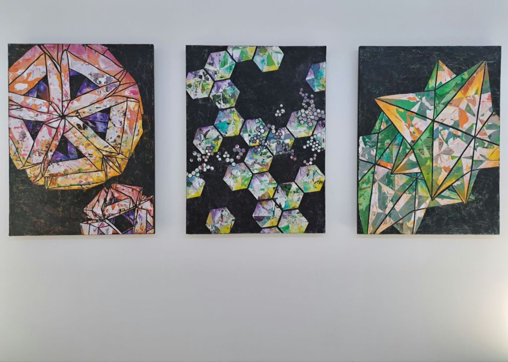 The theme of my work was interconnection, and the main materials used were recycled plastic for the sculptures and recycled papers for the large layered and carved collages.