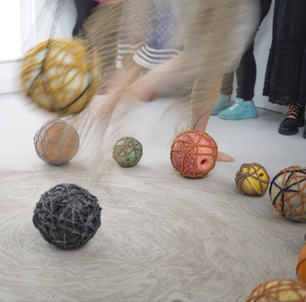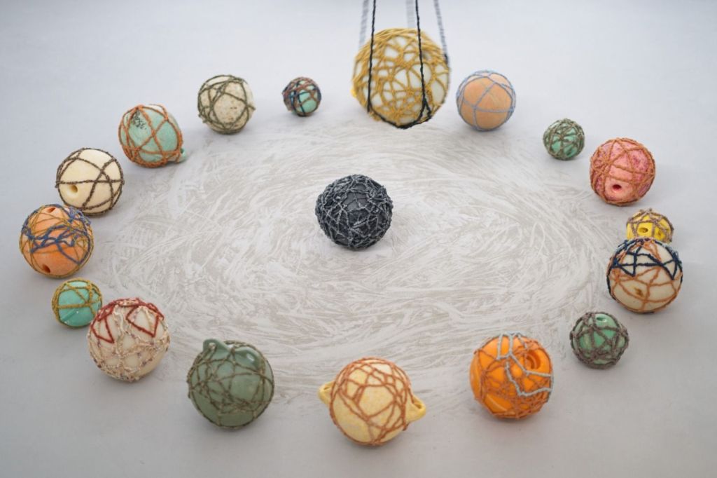 The fishing floats have been collected through years of cleaning plastic debris from beaches, both in Sweden and Ireland. Thrifted threads and yarns have been knotted, building interlinked filaments in a slow ritual, each knot a wish and a prayer for a more connected world.